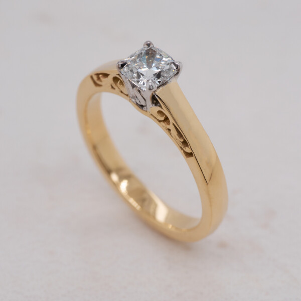 A cushion cut centre diamond solitaire with filigree detailed yellow gold ring.