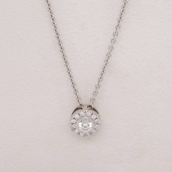 A round brilliant diamond set in a halo setting crafted in platinum.