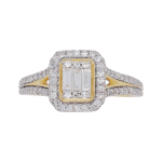 A delicate cluster of baguette and brilliant cut diamonds accented with a beautiful diamond halo in 9ct yellow and white gold with a split shoulder band. With a total diamond weight of 0.50ct.
