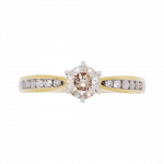 This 18ct yellow and white gold delicate solitaire has fine channel set diamond shoulders. Featuring a 0.62ct round brilliant cut champagne centre diamond and a diamond band featuring 0.186ct.