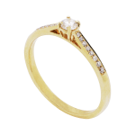 14ct yellow gold elegant solitaire has delicately grain set diamond shoulders. This ring features a 0.12ct centre diamond with 16 side diamonds totalling 0.08ct.