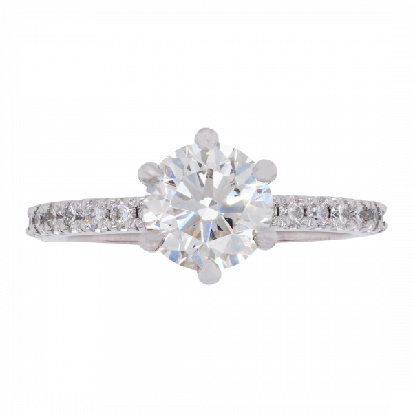 This 18ct white gold delicate solitaire has fine scallop claw set diamond shoulders. Featuring a 1.50ct, I colour, VS1 clarity, round brilliant cut centre diamond and a claw set diamond band featuring 0.30ct.