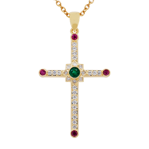 This modern golden cross features an emerald, rubies and diamonds and is crafted in 18ct yellow gold. Chain sold separately. This pendant can be customised to suit your metal and gemstone preferences.