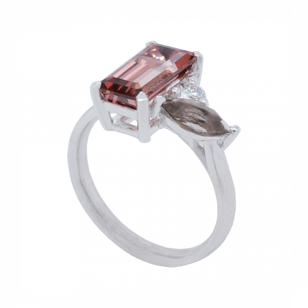 This modern cluster design features a beautiful octagonal shaped Malaya Garnet with a marquise shaped smokey quartz and round diamond crafted in 9ct white gold. This design can be customised to suit your gemstone, metal and budget preferences.