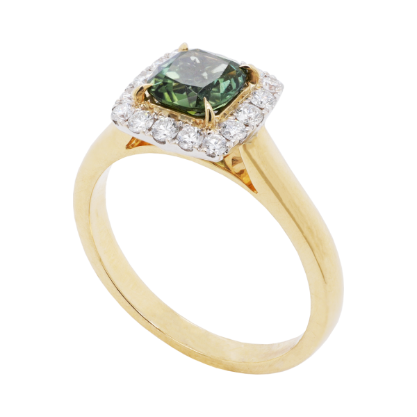 This modern halo design features a stunning cushion shaped 0.84ct green tourmaline with a diamond halo with a total diamond weight of 0.25ct crafted in 18ct yellow and white gold. This design can be customised to suit your gemstone, metal and budget preferences.