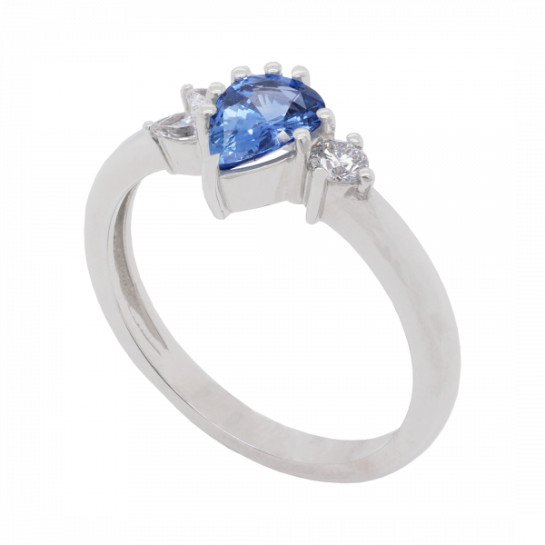 This modern halo design features a stunning pear shaped 0.73ct Ceylon Sapphore with a diamond halo with a total diamond weight of 0.20ct crafted in 18ct white gold. This design can be customised to suit your gemstone, metal and budget preferences.