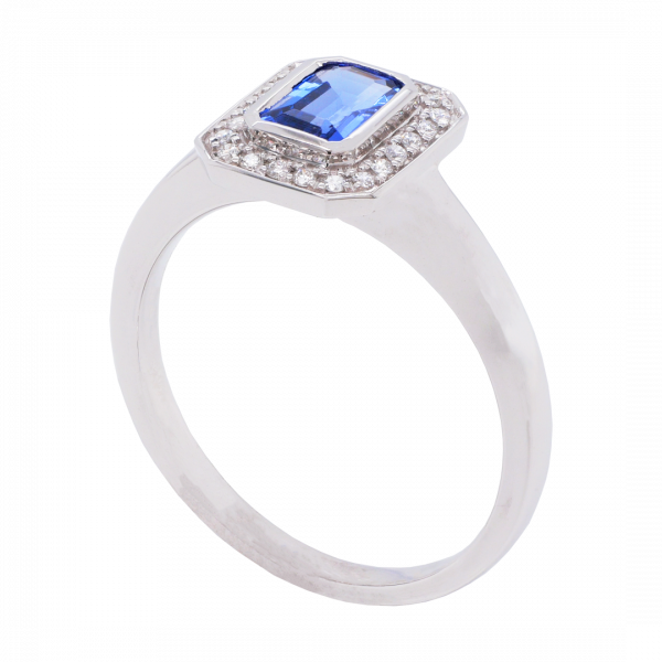 Crafted in 18ct white gold this stunning ring features a 0.61ct octagonal cut tanzanite centre with a brilliant cut diamond set halo totalling 0.089ct. This ring can be customised to suit your budget, metal and gemstone preferences.